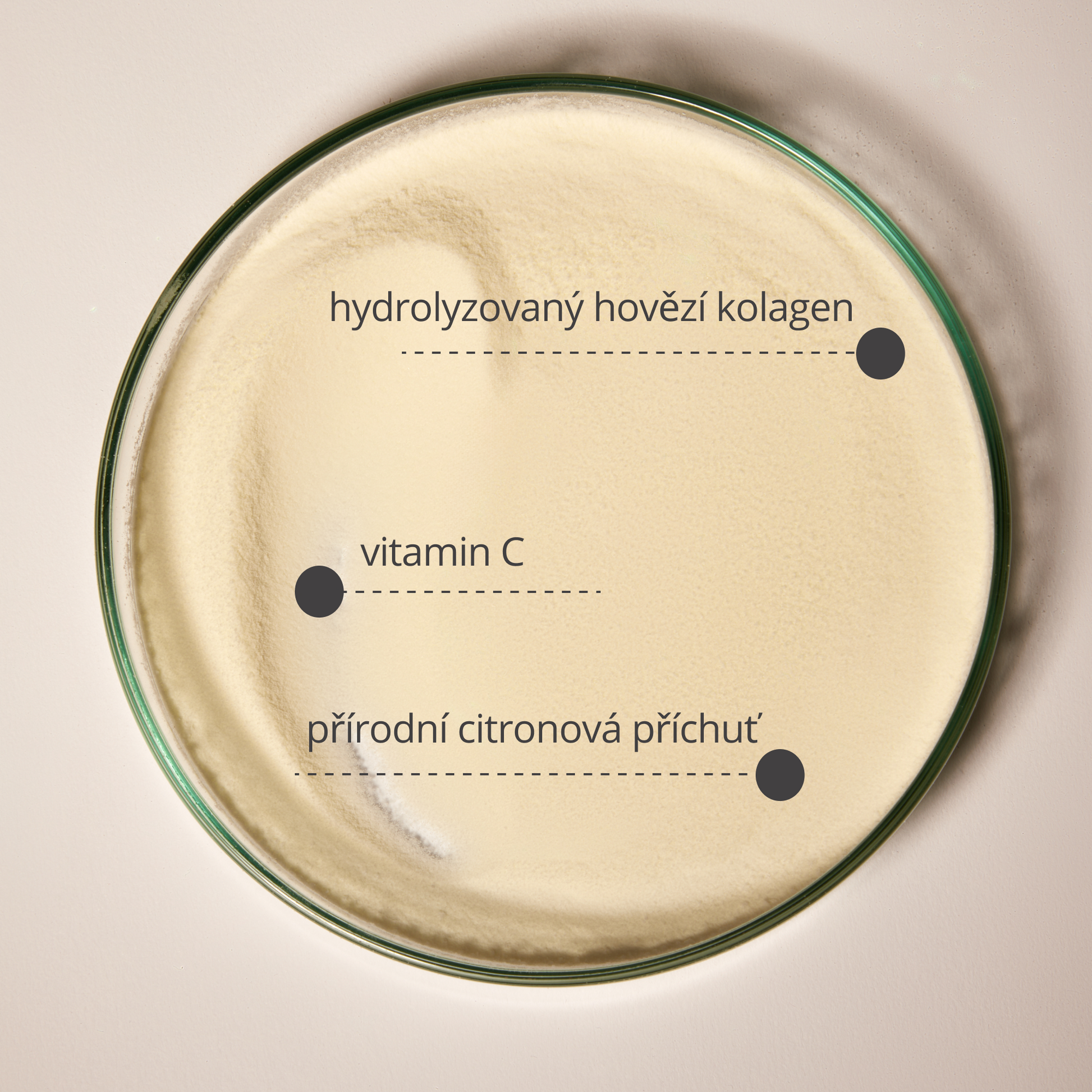 Zloženie v dennej dávke: 12,5 g hovädzí hydrolyzovaný kolagén, 1g prírodná citrónová aróma, 100 mg vitamín C (L-askorbová kyselina).