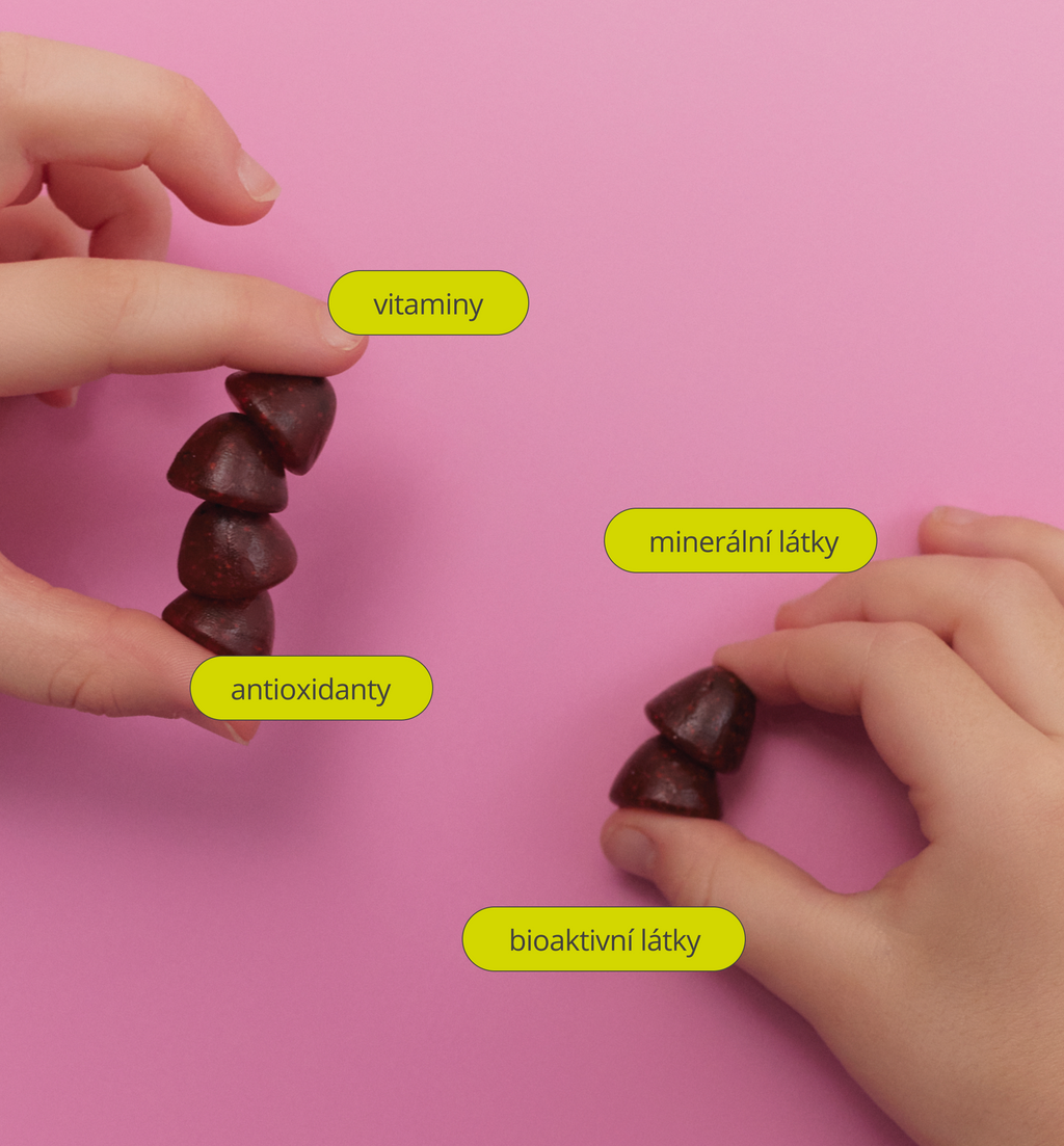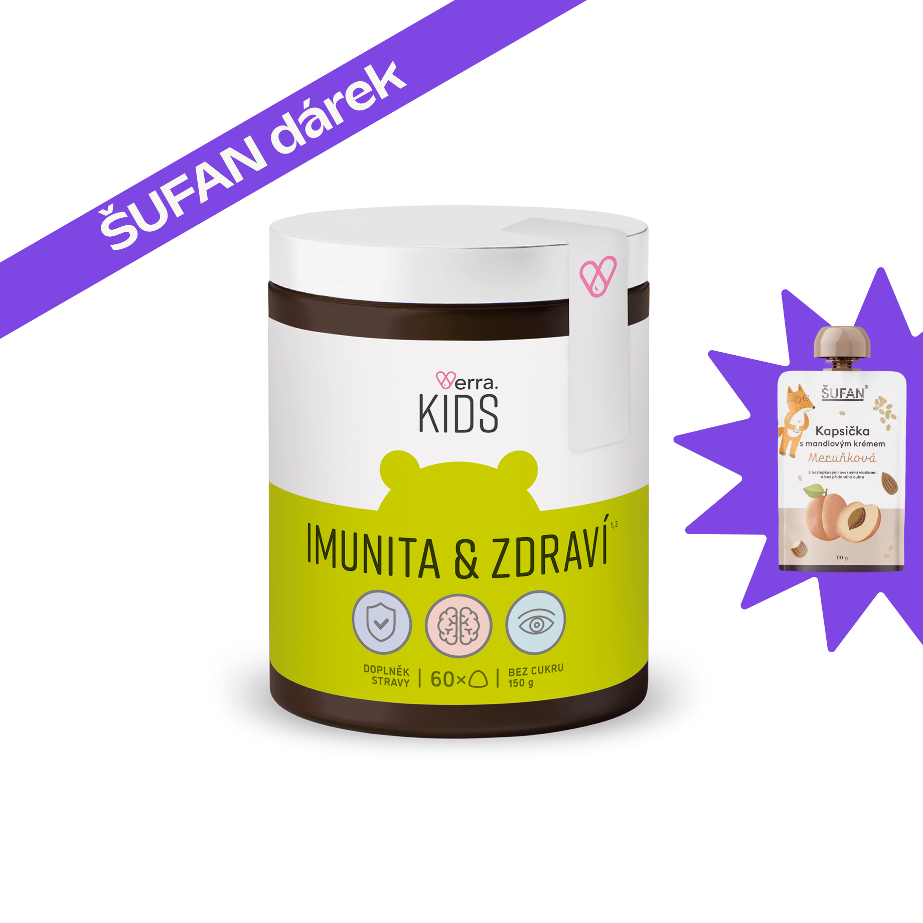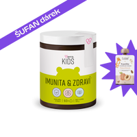 Ide o prémiový vitamínový komplex na podporu imunity a celkového zdravia dieťaťa, ktorý je určený pre deti od 3 rokov. Produkt je vyrobený na rastlinnej báze vo forme gumových medvedíkov s príchuťou lesného ovocia. Produkt IMUNITA & ZDRAVIE je unikátny svojim zložením, ktoré je dôležité pre správny vývoj dieťaťa. Obsahuje kvalitné a potrebné látky v tej najvhodnejšej forme, aby ich telo dokázalo maximálne využiť a vstrebať. Obsahuje mnoho organických mikronutrientov, antioxidant lykopén, prebiotické vlákniny pektín a prírodné sladidlo maltitol, ktorý pôsobí tiež prebioticky a má navyše nekariogénny efekt na zuby (nepoškodzuje zuby). Cholín, ktorý sa v komplexe taktiež vyskytuje, je nevyhnutným prenášačom nervového vzruchu a podieľa sa tak na správnej funkcii mozgu.