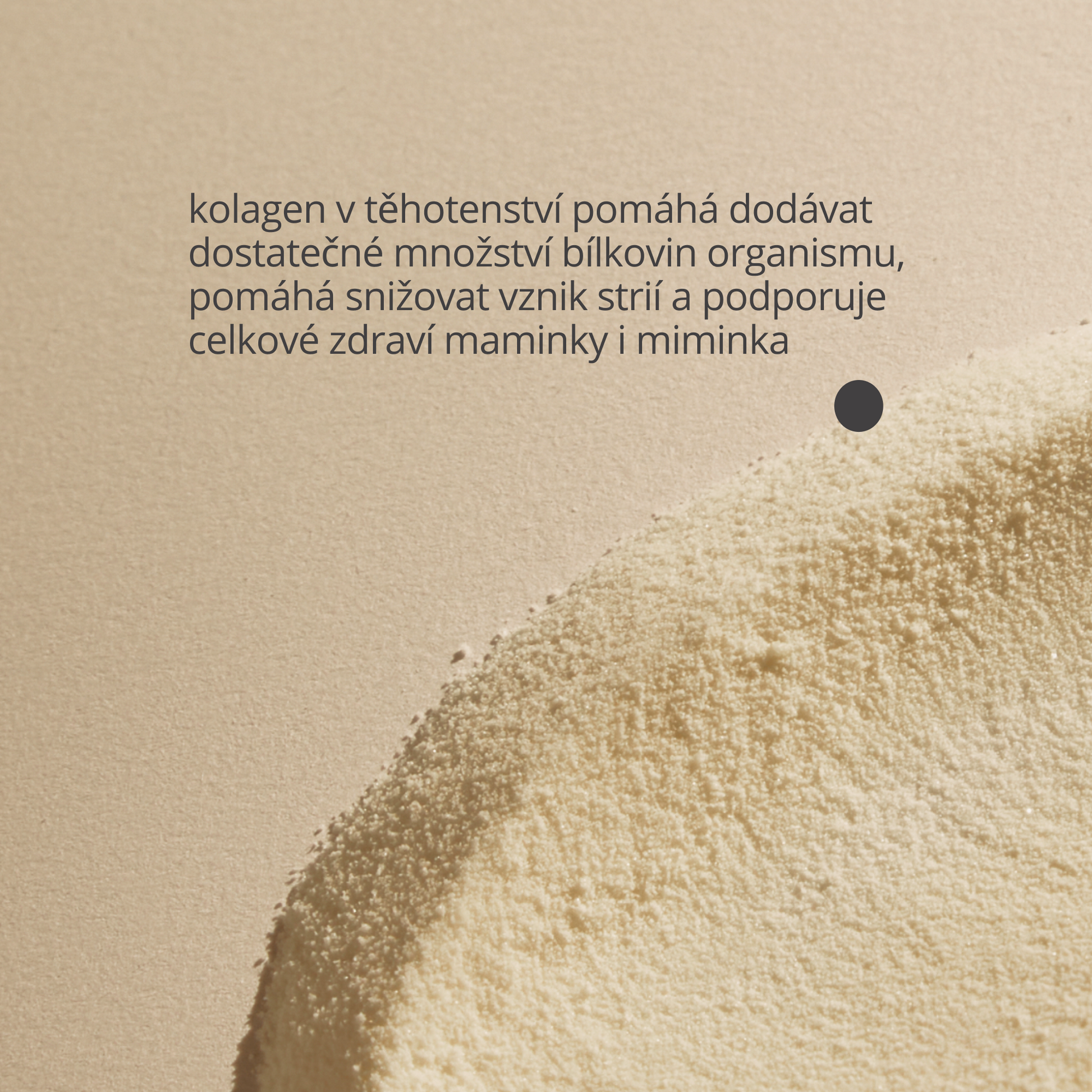 Prémiový hovädzí kolagén v období tehotenstva pomáha naplniť zvýšené výživové nároky na príjem kvalitných bielkovín pre potreby tela matky i dieťatka, udržiava zdravé panvové dno, pôsobí proti vzniku strií a zachováva pevnosť kostí.