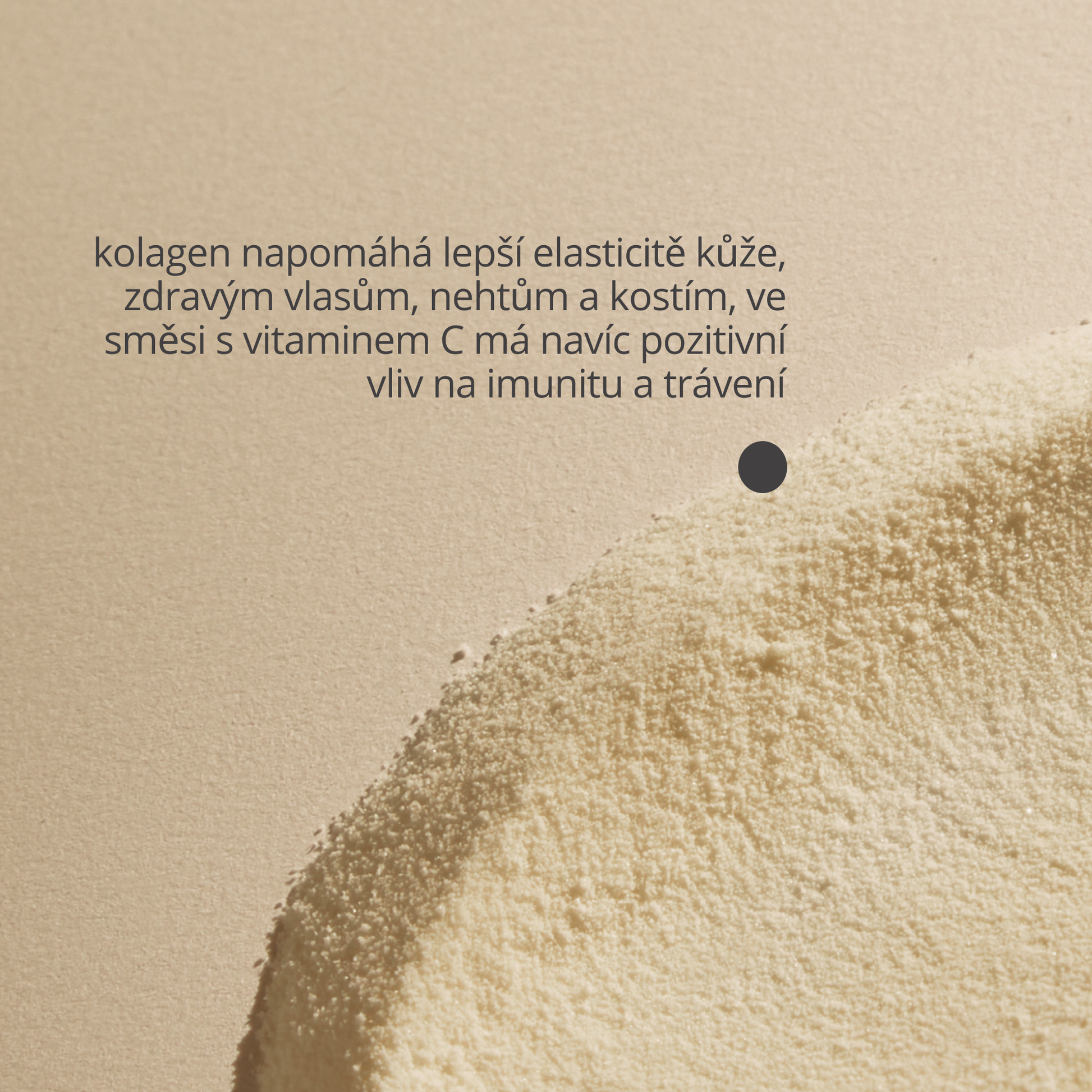 Zmes vysoko kvalitného hydrolyzovaného kolagénu a vitamínu C pre lepšiu pružnosť kože, zdravé vlasy, nechty, pevné kosti, správne fungovanie tráviaceho traktu a imunitného systému.