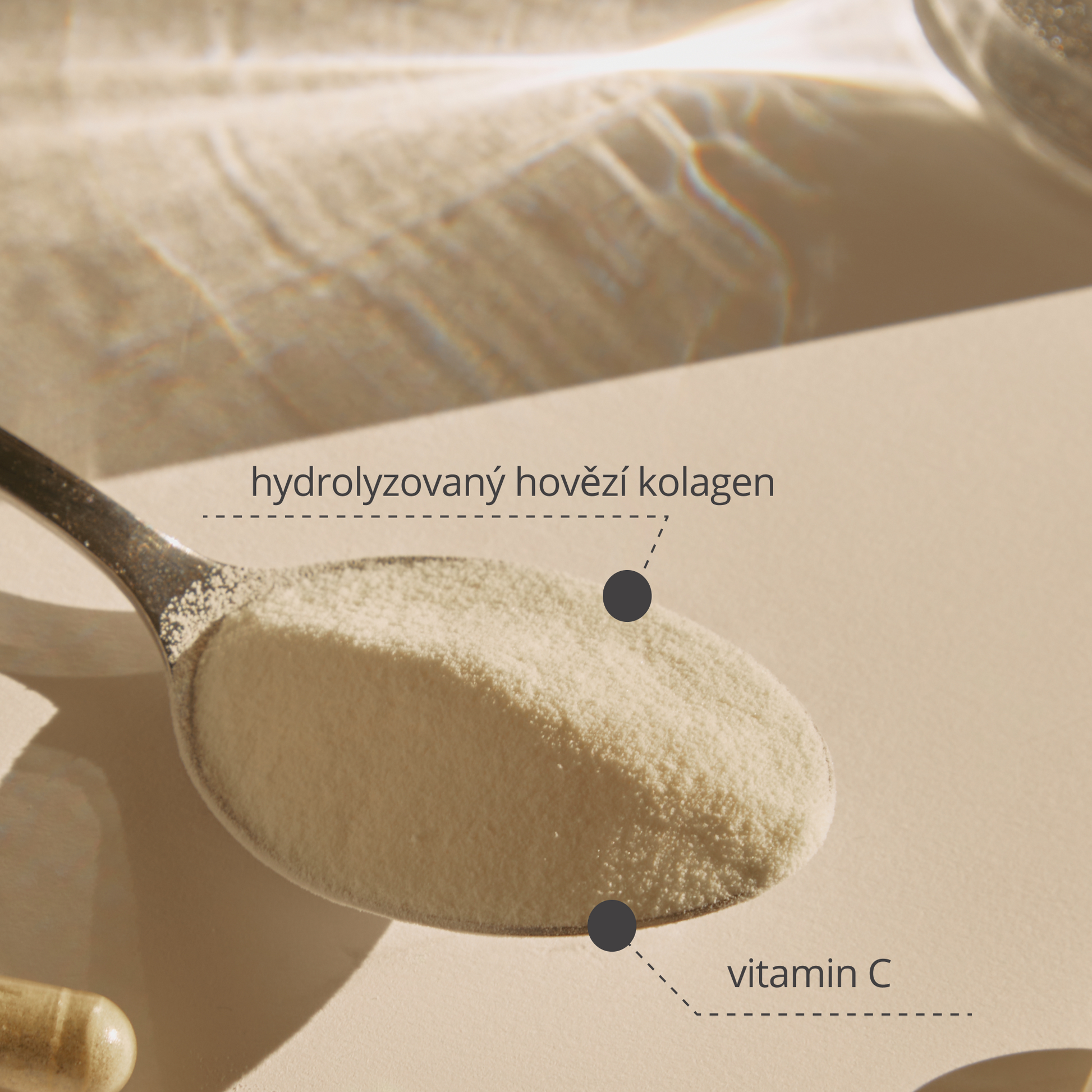 Zloženie v dennej dávke: 12,5 g hovädzí hydrolyzovaný kolagén, 100 mg vitamín C (L-askorbová kyselina).