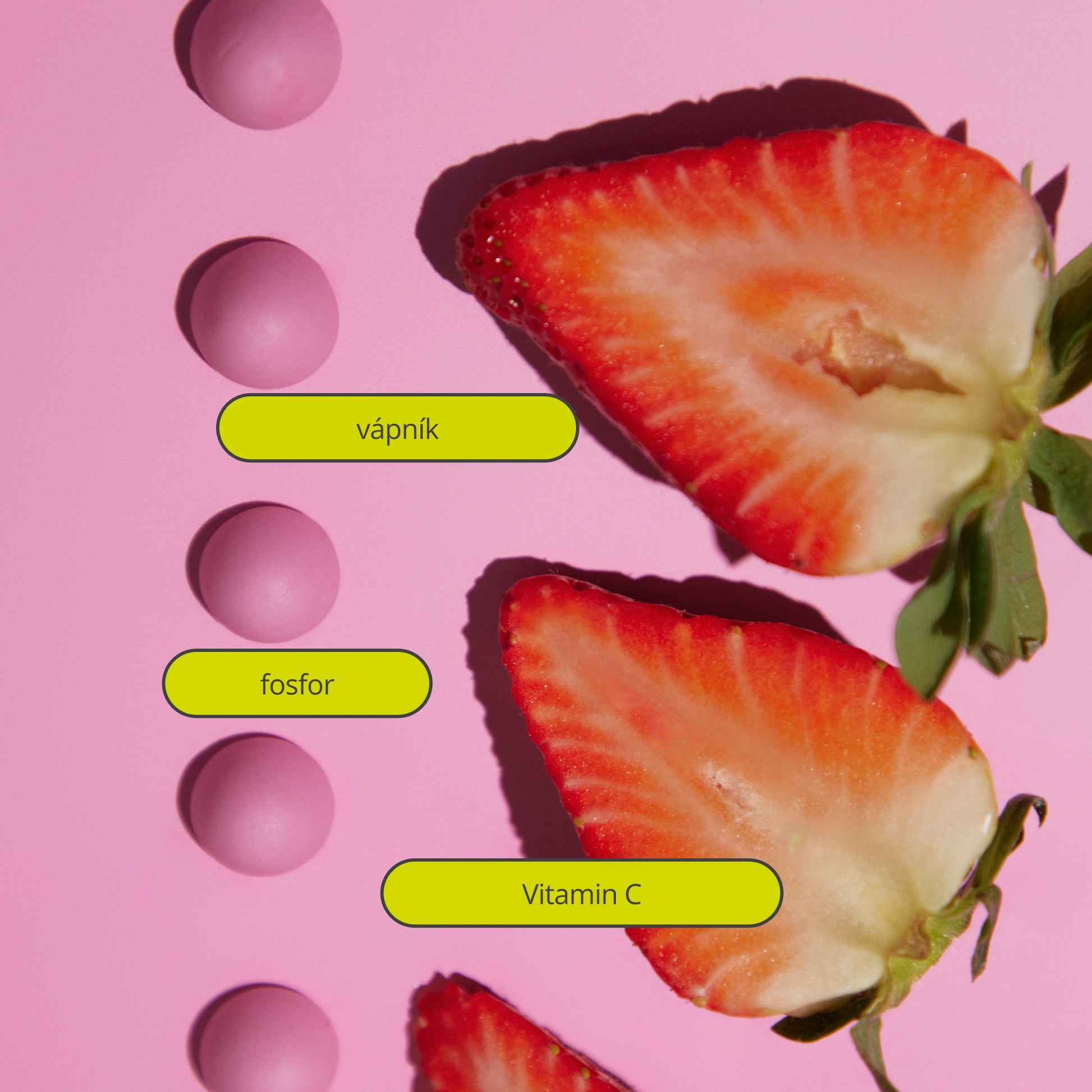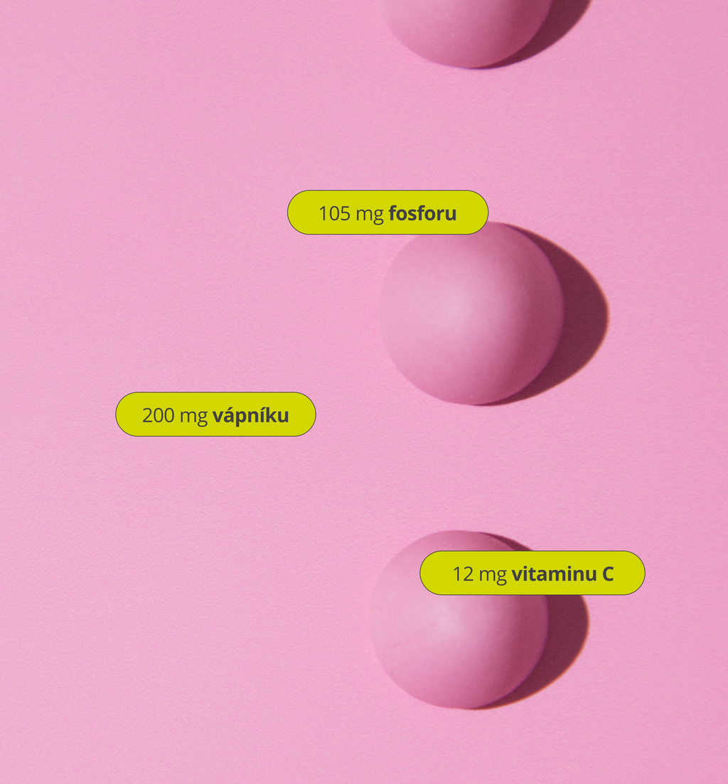 Zloženie v 2 gumíkových tabletkách: sladidlo (maltitol), vápnik a fosfor (vápenaté soli kyseliny ortofosforečnej), pektín (prebiotické vlákniny), regulátor kyslosti (kyselina citrónová, citrónan sodný), prírodná aróma, vitamín C (kyselina askorbová), koncentrát z mrkvy a čierneho ríbezlía, lesklá látka: karnaubský vosk.